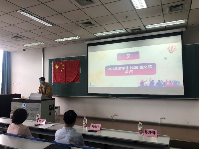 在庄严的国歌之后,2018级项目学生潘文晖代表在校生发言。他以个人的学习经历,讲述项目学习的点点滴滴,表示北邮以学生为中心的教学理念,专业授课、精心管理为项目学生出国留学打下了坚实的基础,希望同学们珍惜时光,与北邮同行,实现新时代青年人的光荣与梦想。
